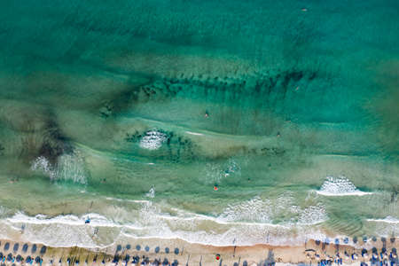 Holiday vacation on the sandy beach, sunbathing and swimming in the water aerial drone photo