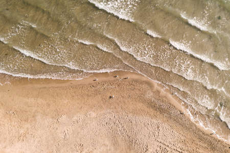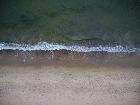 Beautiful Empty Beach textures and waves with white foam, Aerial Birds Eye Overhead Top Down View from above