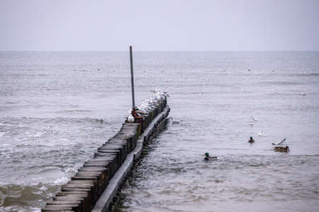 beautiful seaside landscape of the Baltic Sea on a calm day with a wooden breakwater and seagulls sitting on it