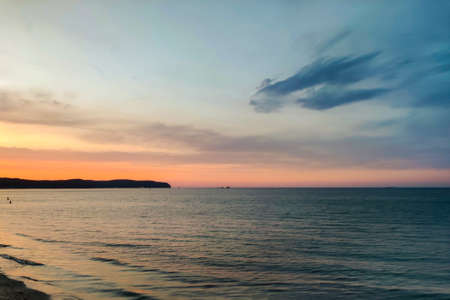 Sea sunset background. Natural cloud over sea. Horizon view scene. Relaxation background.