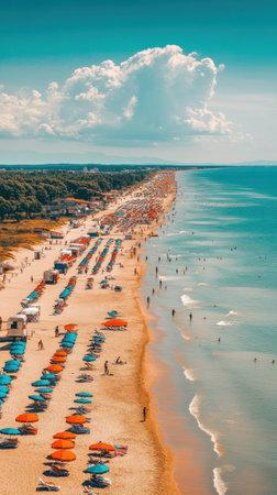 Bright summer day at a bustling beach, where families and friends lounge under colorful umbrellas while others swim and stroll along the shoreline.