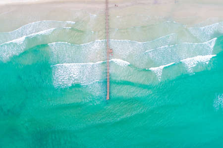 Surfers in the surf waiting for waves in the turquoise ocean off the Victorian Coastline, top down aerial drone view