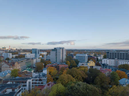 Beautiful Vilnius city panorama in autumn with orange and yellow foliage. Aerial evening view. Fall city scenery in Vilnius, Lithuania