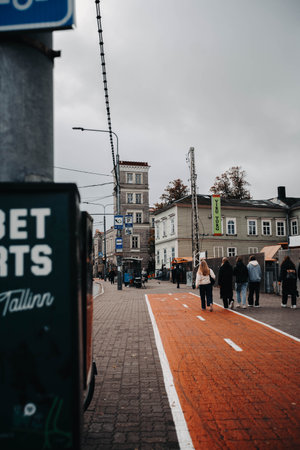 Bus stop and buildings on street on cloudy autumn day in Tallinn, Estonia