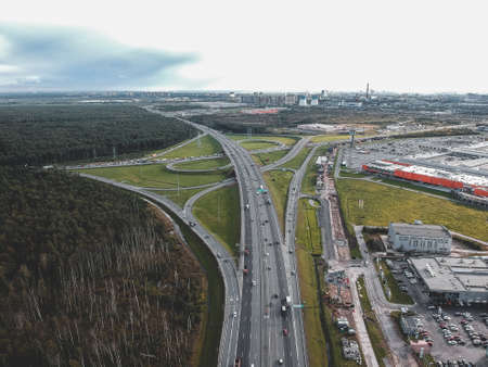 Aerialphoto highway, interchange, car, forest. Saint Petersburg, Russia.