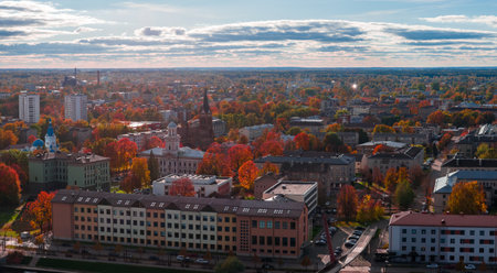 Aerial late afternoon view of Jelgava with autumn city landmarks