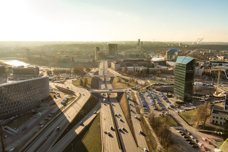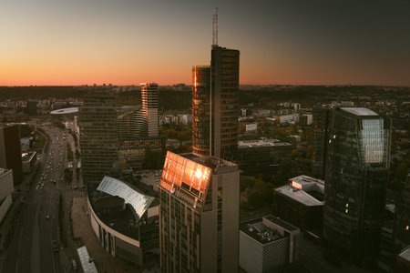 Beautiful aerial evening view of Vilnius business district with scenic sunset illumination. City life in Vilnius, Lithuania.