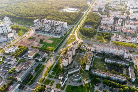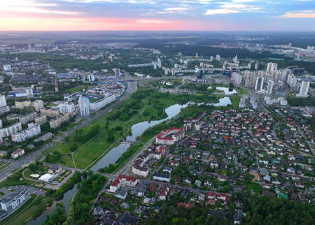 River in city on sunset, aerial view. Suburb houses and multi-storey residential buildings near the river in Minsk, Belarus. Cottages and wooden suburban house. Suburban house on sunset panarama, drone view