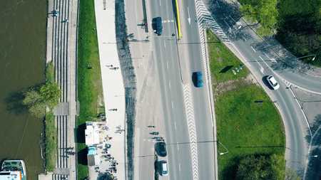 Aerial shot of car road and van cafe on river embankment, top down view