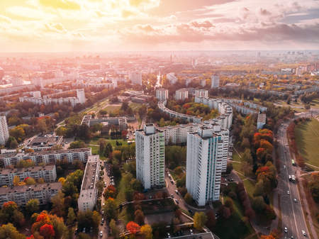 Sunny sky shining clouds over city landscape, stretching for many kilometers. Aesthetics multi-storey apartments mixed with autumn yellowing trees. Minsk, Republic of Belarus. view aerial drone