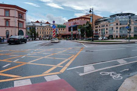 Moscow, Russia - Jul 2020: General landscape view at tradition Moscow architecture. City life on the main streets of the city. The citizens go on their own business. Automobile traffic.