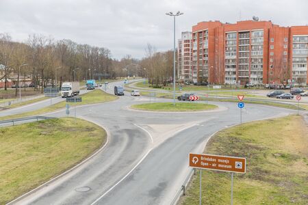 City Riga, Latvia. Cars move on the road. Roundabout in front.25.02.2020