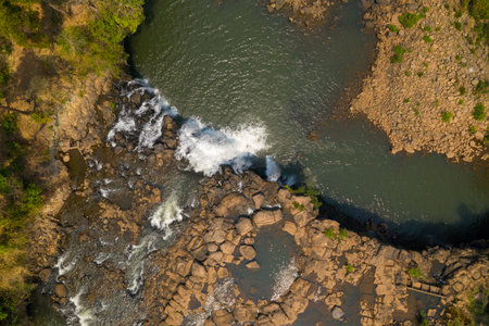 Top-down perspective captures Tad Lo waterfall as water cascades over rugged rocks into a calm pool, surrounded by scattered boulders and sparse greenery in southern Laos. Sunlight highlights the textured stones and gentle flow, evoking a tranquil natural landscape.