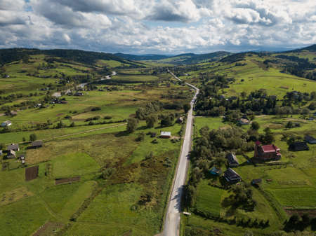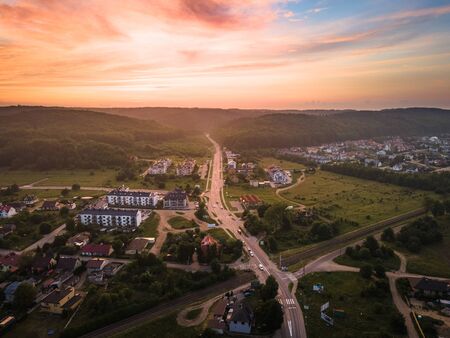 Aerial photo of a typical Polish hosing estate in the mountains towns, taken on a sunny part cloudy day using a drone, showing the housing estate and farmers fields