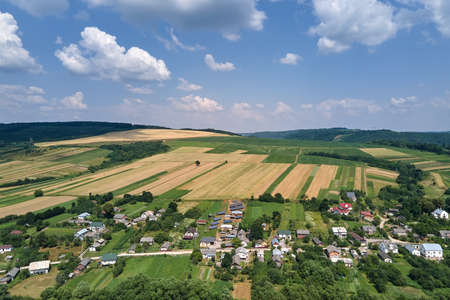 Aerial landscape view of green cultivated agricultural fields with growing crops and distant village houses