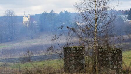 Autumn meadow on the background of the old church on a hill in Krevo, Belarus.