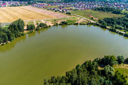 Aerial view of the Mashkovsky pond in the village of Mashkovo, Zhukovsky district, Kaluga region, Russia
