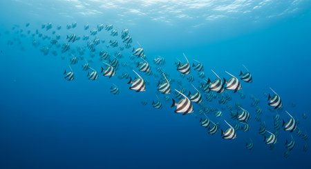 tropical fish swimming in school, their movements synchronized, created with generative ai