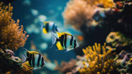 A captivating scene featuring tropical fish swimming gracefully among coral reefs, highlighting the vibrant colors and rich biodiversity of underwater ecosystems.