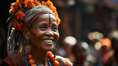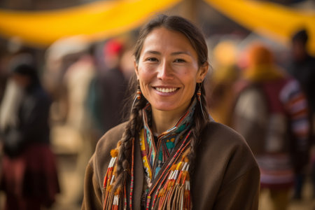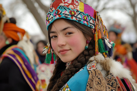 A captivating portrait showing a woman with dark braided hair adorned in traditional colorful clothing. The vibrant backdrop complements her animated expression, celebrating cultural heritage.