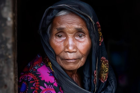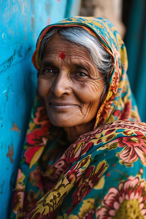 Portrait of an elderly woman with deep wrinkles and striking blue eyes. She is wrapped in a colorful knit scarf, exuding warmth and wisdom. The soft lighting highlights her gentle expression