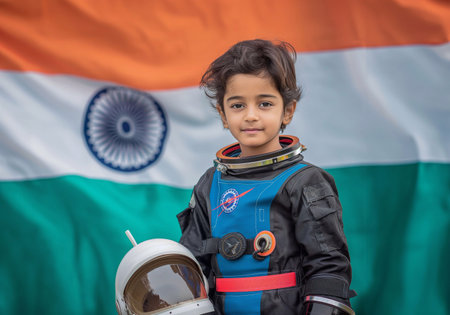 Indian child in an astronaut suit, Indian flag background. Generative ai