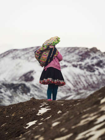 Inuit senior woman wearing colorful winter jacket in snowy mountains