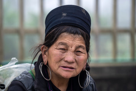 Sapa, Vietnam - march 06, 2020 : Ethnic Hmong woman wearing traditional attire and jewelry wait for tourists to sell handicrafts on the street in mountain village Sapa, North Vietnam