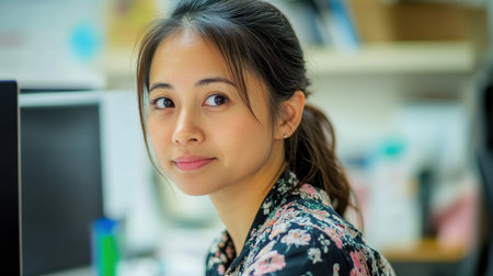 A young woman in an office environment displays a calm and focused expression, reflecting professionalism and engagement in her work.
