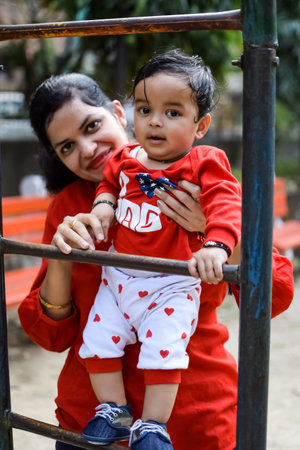 Loving mom carrying of her baby at society park. Bright portrait of happy mum holding child in her hands. Mother hugging her little 9 months old son.