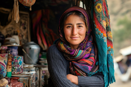 A joyful woman 45 years old from Afghanistan displays a bright smile while wearing traditional clothing. She stands confidently, embodying a sense of peace in her rural community. Generative AI.