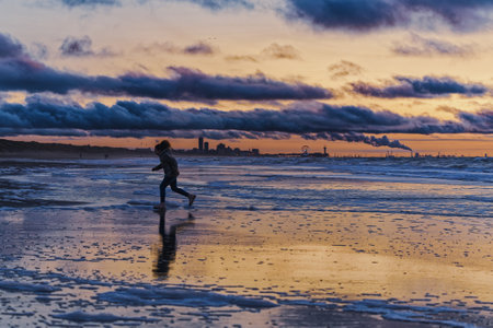 Man runs on beach of north sea in the netherlands