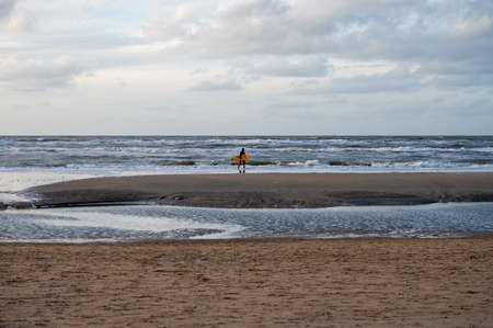 Surfer finished his training on cold water of North sea near Zandvoort in Netherlands in winter