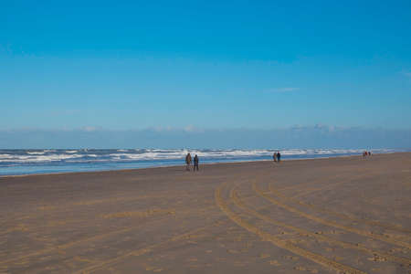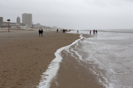 Zandvoort,Holland,13-jan-2021:people walking at the beach with the sand in foreground and the horizon and sea as background