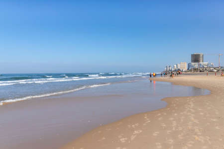 City Beach. Waves on the coast. Footprints in the sand. Mediterranean Sea. Israel