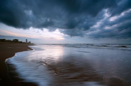 Gloomy beach landscape under dark clouds with calm waves lapping at the shore