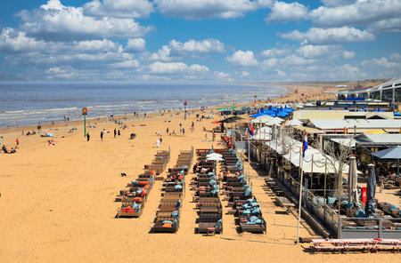Scheveningen, Netherlands - August 24, 2021: People enjoying at a busy beach on a sunny day