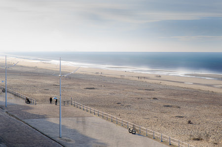 Unidentified people walking on wide sandy beach or North sea near Zandvoort in Netherlands