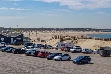 Brouwersdam, Zeeland, Netherlands. April 27, 2021. Cars parked in the parking lot at the 7th structure of Delta Works, beach and the sea in the background, sunny day with clear blue sky