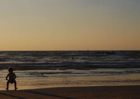 small child on sea on sand in sunset