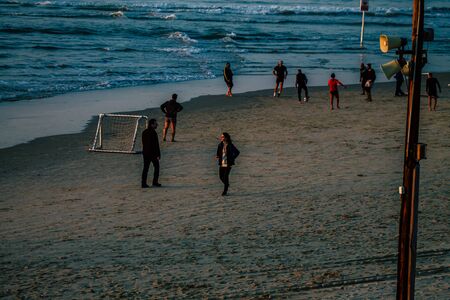 Tel Aviv Israel January 10, 2020 View of unidentified Israeli people having fun on the beach of Tel Aviv during the sunset in winter