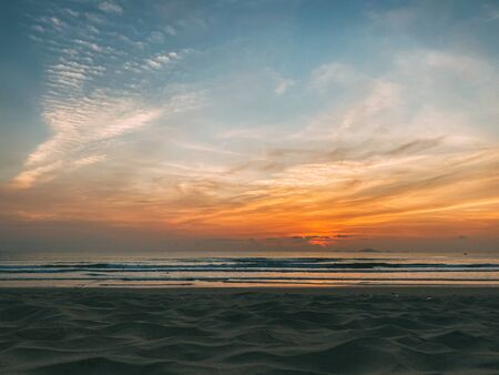 Dawn on the sea with a view of the horizon, colorful sky from the sun rays, clouds on a blue sky. Sandy beach on the seashore, waves on the sea, copy place