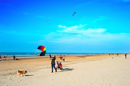 Zandvoort, the Netherlands- June 20, 2015: Tourists are walking along the sea line. Zandvoort aan Zee is a main sea resort and touristic center with a long sandy beach bordered by coastal dunes.
