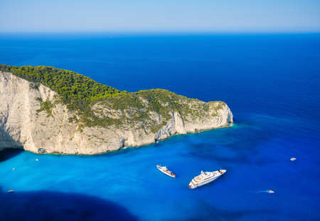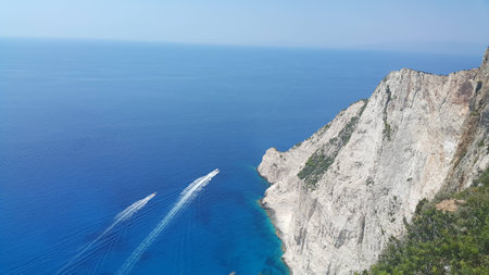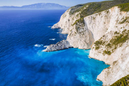 Aerial view of limestone cliffs close to Navagio or Shipwreck Beach on Zakynthos Island, Greece. Summer vacation travel concept