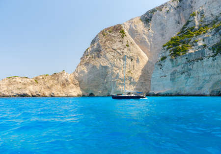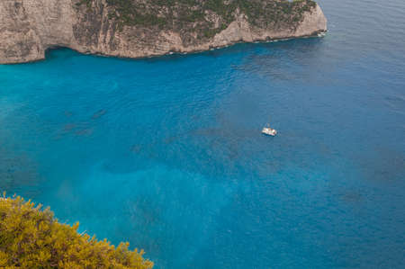Lonely catamaran yacht in blue bay of Navagio beach. Azure turquoise sea water pattern near paradise sandy beach. Famous tourist visiting landmark on Zakynthos island, Greece