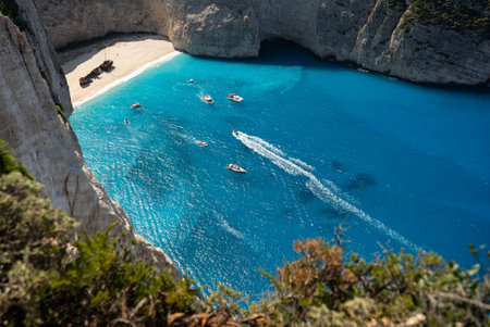 Top view of Navagio Shipwreck Beach on Zakynthos island, Greece. Famous attraction landmark must-see place visit in summer vacation
