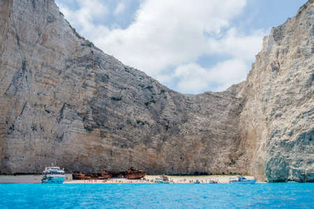 Rock Cliffs in front of Navagio beach Zakynthos. Shipwreck bay with turquoise water and white sand beach. Famous marvel landmark location in Greece
