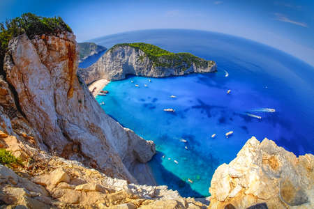 Navagio Bay Zakynthos. Shipwreck beach view from above. Fisheye panoramic shot, HDR effect