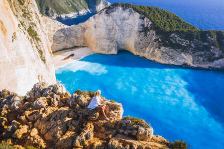 Aerial view of woman tourist enjoying Navagio Beach - Shipwreck beach - on Zakynthos Island, Greece. Summer travel concept