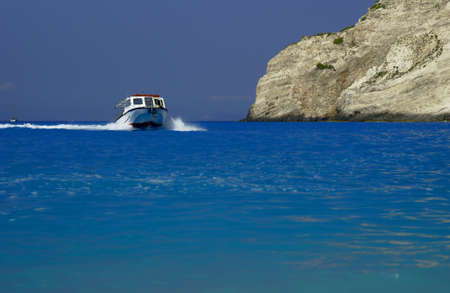 Zante fantastic coastal view with white cliff and azure sea water. White tourist ship sailing full speed on open water